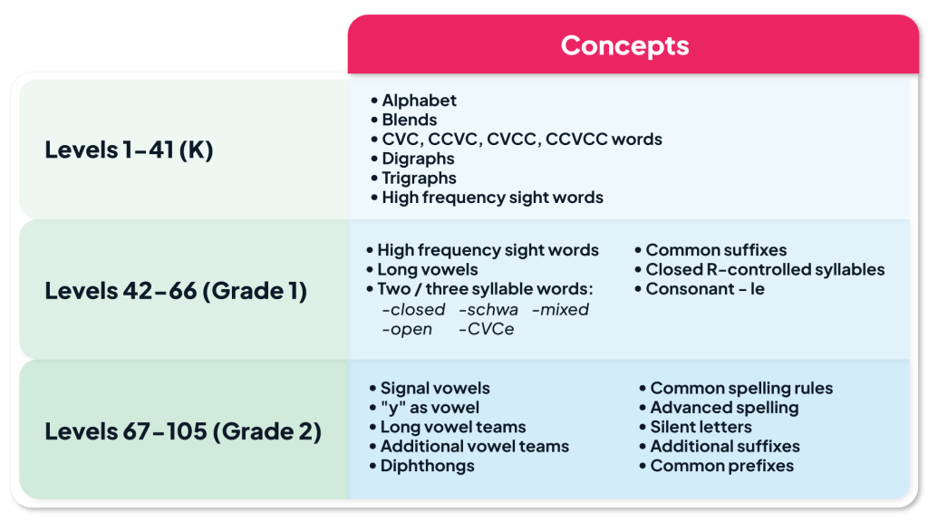 Our Scope and Sequence systematically introduces the most common grapheme-phoneme patterns in the English language, ensuring students build a strong phonics foundation. When paired with explicit instructions from their teacher, students develop the ability to apply phonics skills across different reading and writing tasks. By reinforcing these relationships through repeated exposure and structured practice, phonics knowledge becomes automatic. Our app has activities that promote both decoding via reading and encoding via spelling dictated words using letter tiles.